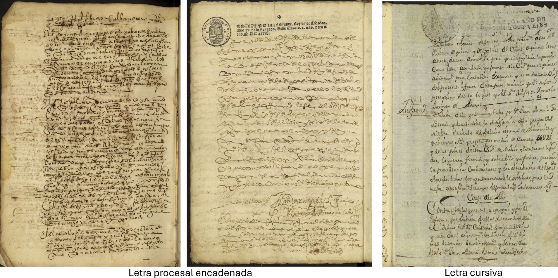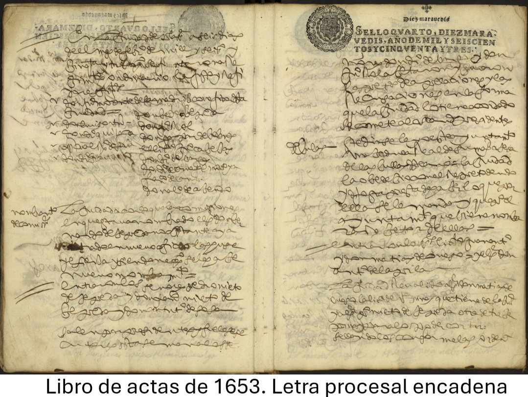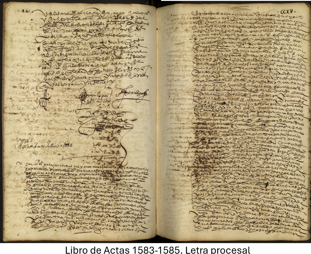 - Finales del siglo XVI: Predomina la letra procesal encadenada, compacta y de lectura difícil. Las palabras aparecen unidas mediante ligaduras y abreviaturas abundantes, buscando economía de espacio.